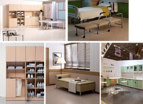 治疗、处置空间包含病房、治疗室、护士站,是长时间提供医疗服务的空间。现代的治疗、处置空间侧重结合现代化设备,营造居家般温馨舒适的专业医疗环境。灵活的模块化组装方式,功能设计紧凑,确保物品和药品被快速制备以为病人治疗,简单的设计为病人营造舒适环境。