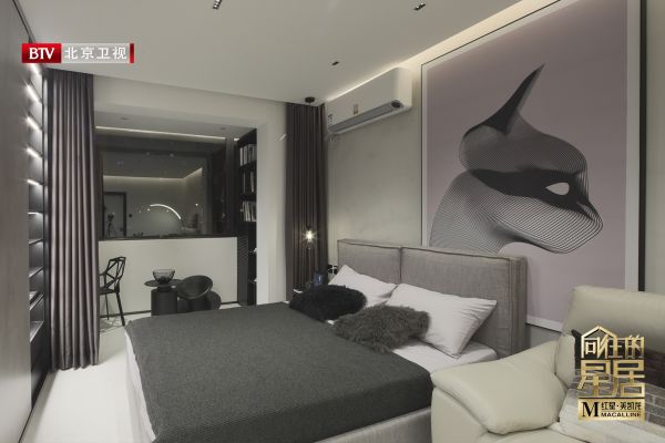 阳台和卧室打通,黑色帘子做软隔,将睡眠区空间一分为二,整个卧室营造出让人安静且舒适的氛围。