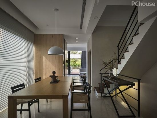 拾阶而上,明净的用餐区域跃然面前,狭长型的公领域在眼前舒展,开启生活场所的宁静主题,并透过黑色金属及木质物件构成安稳意绪,形塑紧密而不凌乱的流畅视感;只待风光洒入,自在晕染左右场域,成为涂刷家居的温暖淡彩。每晚当吊灯开启,点亮一桌细心布置的餐饭,引领家人细细品尝那幸福滋味,将历经一日的五味杂陈在暖心谈笑中咀嚼消化。