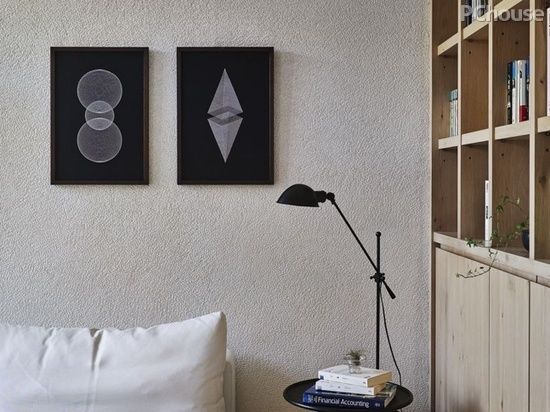 接着入内探寻,洁凈而温馨的客厅以「白」为中心色彩,于天地壁运用异质材扣搭出一方静谧氛围;此外,天花板斜向抬升的设计,则是在考虑量体原先高度及保留充足管线通道下,为屋主贴心拓宽的最高居住视野。而在简约线条速写出的空间轮廓中,设计师精心选用两种各具风味的木质构件——首先是自然收边的原木茶几及电视下平台,将天然气息晕染家居,进而后方平整而带清浅节眼的板材映入眼帘,组成收纳性十足的半开放式壁柜,与前者溶融出林野般的恬淡意境,使起居其中的家人能随时拈来一片祥和日常。