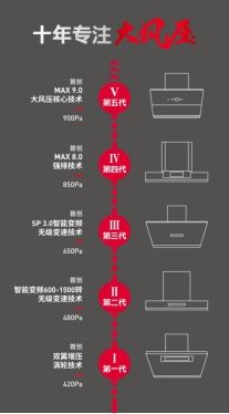 2008年,德意开始专项研究油烟机风压与空气动力学的课题;2012年德意推出420Pa大风压的1898油烟机,首次提出“大风压油烟机”的概念;2015年,油烟机新物种穹顶系列在德意诞生,其中HT2088风压突破480Pa; 2016年,近吸式V6系列将大风压推进到650Pa;2018年,极智系列850Pa超大风压油烟机问世,突破行业极限;而在2019年中国家电及消费电子博览会上德意A6系列首次亮相,900Pa超大风压再次震撼业界。十年来的专注和坚持,德意掌握了大风压的核心技术,在油烟机强排领域拥有绝对话语权,并不断引领着行业的进化。