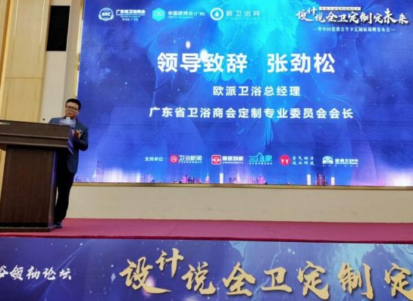 作为活动主办方,广东省卫浴商会定制专业委员会会长、欧派卫浴总经理张劲松先生在大会上发表讲话。