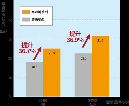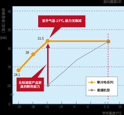 FLEXMULTI 寒冷地系列, -15℃维持额定制热工况制热能力,能力无衰减。制热运转温度范围扩展到-30℃,基本覆盖了我国大多数寒冷地区。