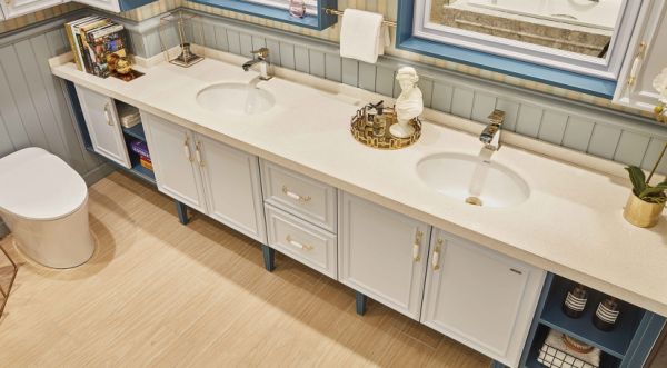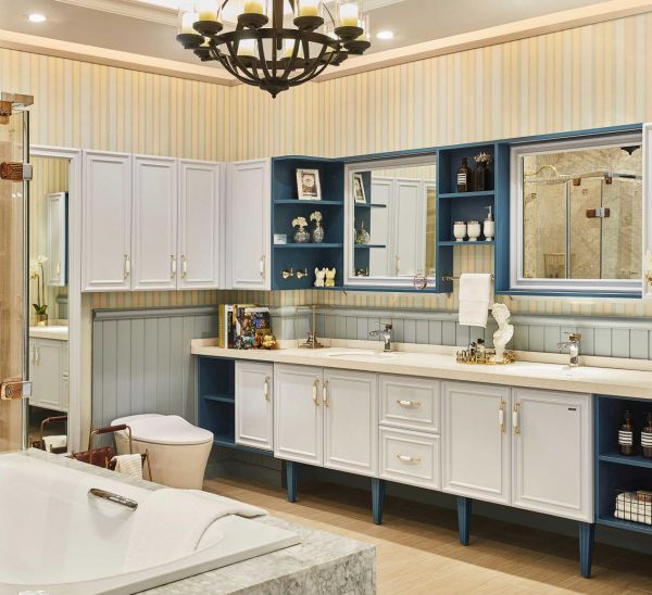 当然定制卫浴不光是产品规格符合你的心意,在美观性上也要兼顾,如果你对设计感不是特别有把握,建议可以选一款百搭的系列。阿曼达的经典美式风格,简约的线条感,为卫浴空间提升气质,加上浴室柜中墨蓝青与天空灰的碰撞,低调中带有一点奢华,在复古与时尚之间随意切换,可以与美式、欧式、现代等多种风格的家居装修所搭配。