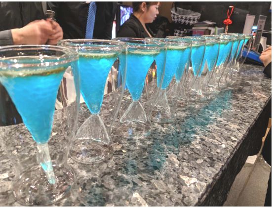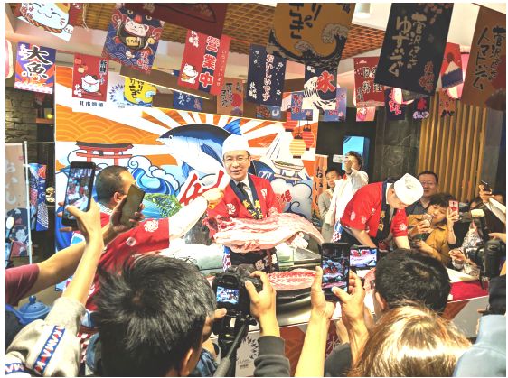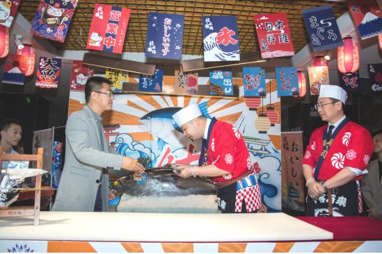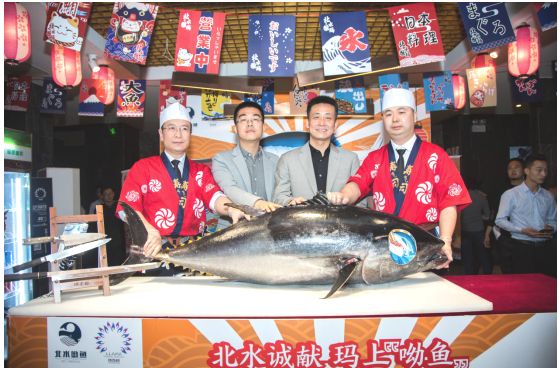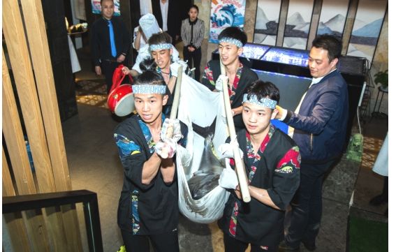 看过花式调酒表演后,在众人的掌声和欢呼声中,一只140多斤的蓝鳍金枪鱼被四名高喊“吃鱼在北水,年年都有鱼,美味来雅玛,口口都新鲜”口号的厨师抬进现场。