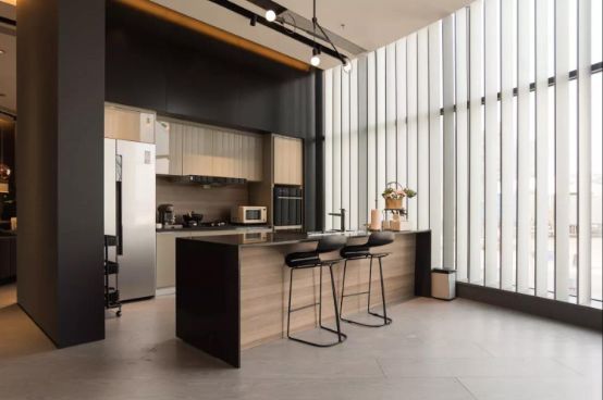 工业风格的厨房在别墅设计中非常流行,暴露于外的原始材料,不加粉饰的粗犷结构,都带有鲜明的工业个性,体现了主人自由奔放的性格。