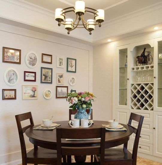 餐厅区域仍旧使用原木栗色的实木餐桌椅,稳重而富有时代感,圆桌的造型使得就餐的一家人更为亲密。 白色墙壁上没有过多的装饰,改造成一面简约的照片墙,装饰空间的同时温馨感倍加,一家人的生活点滴与成长瞬间都能够很好的记录下来。