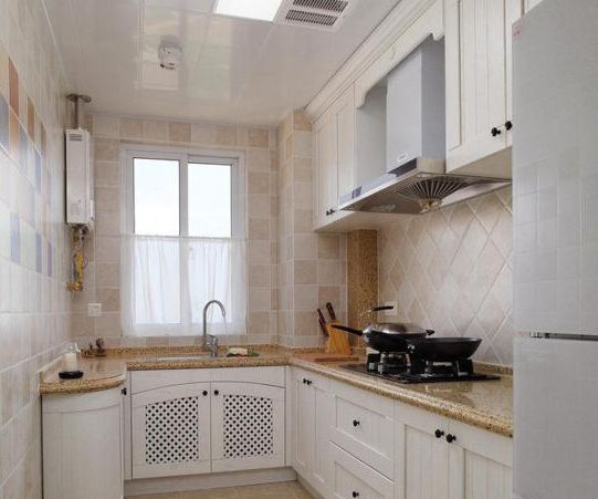 虽为美式的装修风格,但中国人有着特殊的饮食习惯,因此采用封闭式厨房更为实用,整体采用白色的橱柜干净明亮,使得做饭的心情都要开朗不少,米黄色的防滑地砖、墙砖更增添了几丝甜蜜,把浓浓的爱灌输在了每一道菜肴中。
