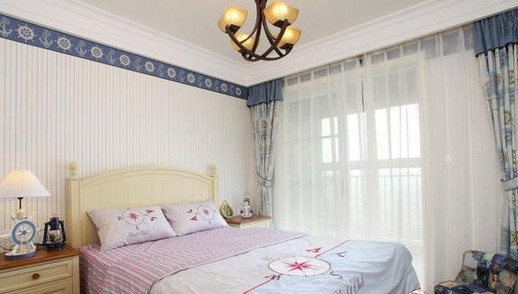 奶茶白的墙纸搭配着蓝红色的床品,把美国国旗的主色融入到了卧室之中。