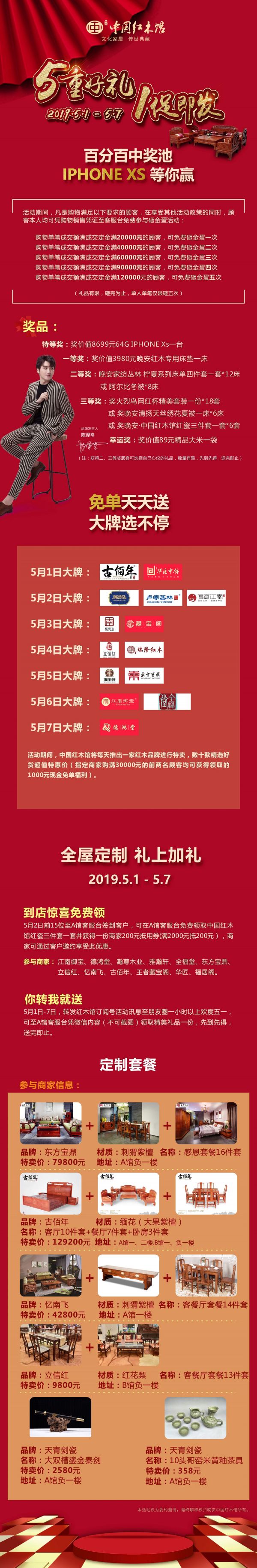 5月1日-5月7日,晚安中国红木馆带您狂享五一,大牌特卖实惠多多,5重好礼1促即发,还有IPHONE XS等您带回家!