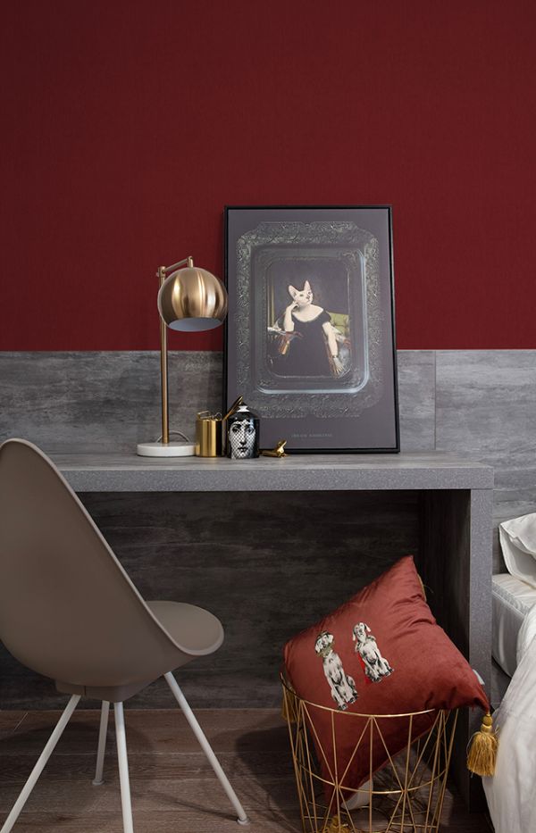 美诺尔酒红是高贵的象征,也拥有热情奔放的气质。红色与灰色的美妙碰撞,有效地平衡了空间色彩,整体走复古混搭路线,体现了绅士的大胆与勇气。