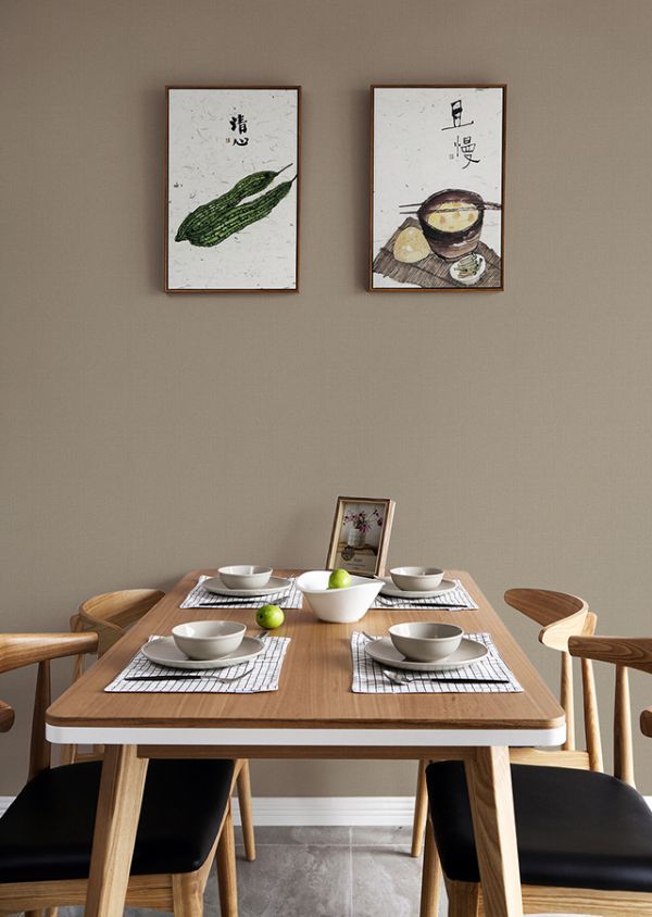 在相对狭小的空间里,完美的对称关系为家居带来了美妙效果。冰咖啡色占据了整个餐厅的墙面,搭配上亮白色的点缀,带来宽敞而明亮的视觉效果。