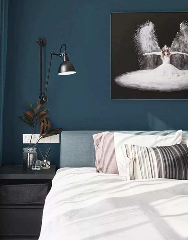 摩洛哥蓝为主色调的卧室,宛若暗夜里的天空,伴着徜徉的晚风,唯美而动人。搭配魅影黑的装饰画,亮白色的床品,总体设计简约而不简单。