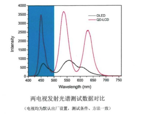 测试结果显示,在400-500nm蓝光范围内,OLED电视蓝光放射量为29923(400、500nm曲线下积分值,相对值,无单位),QD-LCD电视蓝光放射量为87140(400、500nm曲线下积分值,相对值,无单位),说明OLED电视发生蓝光损伤的风险小于量子点液晶电视