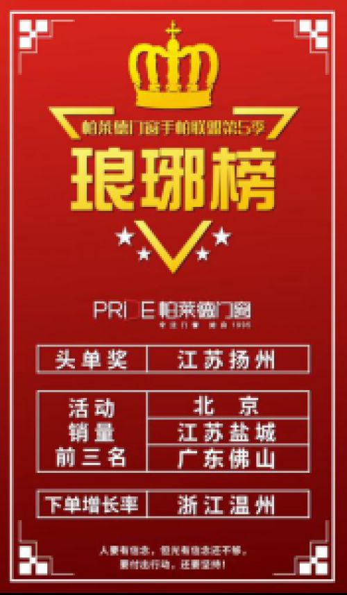 首先恭喜以上获奖的家人们,经过一个多月的努力和拼搏,拿到实至名归的荣誉。从荣誉的榜单上来看,大家的激情与实力的爆发还是滔滔不绝,每一个增长的数字,都是获奖者的见证,也是他们带领团队的付出的一起收获的成果。这印证了一个道理,一个人的力量是战胜不了团队的力量的,团队的共同努力才可以把业绩更上一层楼。从第一季到第五季的手帕联盟,每一次的增幅的感觉就想是雨后春笋,节节高升。不管你是在默默付出中,还是已经在爆发的路上,只有紧跟帕莱门窗的脚步,我们才可以越来越强,一起走向新的巅峰。