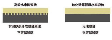 传统的水泥砂浆贴瓷砖方法已经使用很久了。这是因为大釉面砖在过去使用率高,泡水后的釉面砖和水泥砂浆形成了相互嵌入原理,这样可以保持长时间不脱落。然而人们对装修风格多样化的追求,瓷砖的市场也要顺应变化。低吸水率的玻化砖、仿古砖、文化石、抛光砖、人造石、天然大理石、瓷片等上墙已经成为了一种主流。瓷砖市场发生了变化,而作为瓷砖的“伴侣”水泥砂浆依然一尘不变,当然贴不住啦。掉砖,空鼓则是必然。这些瓷砖因为吸水率较低,水泥砂浆无法形成钥匙孔原理,只是粘贴在表面,所以,很短的时间瓷砖就会脱落。轻者砸坏家里的灶台、燃气灶、电饭煲等家电,造成财务的损失,重者砸伤人,造成的危害就很严重了。我有一个朋友,他买的微晶石半年就全部脱落了,光瓷砖损失了10000多,这么大的一笔损失,让作为听者的我都觉得很心疼。
