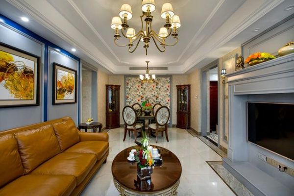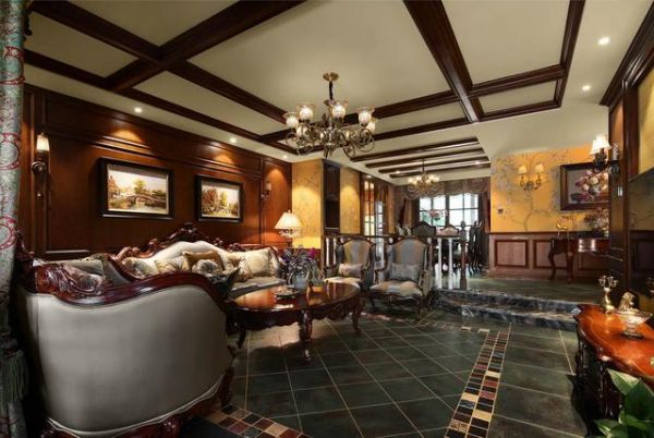 美式客厅风格较多采用嵌入式石膏吊顶,搭配精致的水晶吊顶,营造出一种怀旧、浪漫的感觉。以大理石作为地面装饰材料,光泽感佳,在沙发区铺上大幅花纹地毯,使空间区域划分更加清晰。复古造型的组合沙发,以及茶几都具有上乘的质感,让美式古典风格得以进一步的彰显。