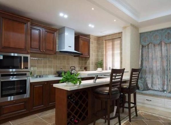 厨房的装修要求开放式。厨房在美国人眼中一般是开敞的(由于其饮食烹饪习惯),同时需要一个便餐台在厨房的一隅,还要具备功能强大又简单耐用的厨具设备,如水槽下的残渣粉碎机,烤箱等。需要有容纳双开门冰箱的宽敞位置和足够的操作台面。