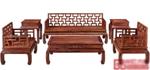 红酸枝《鸿运沙发》则对雕刻手法有更高的要求,圆雕、浅雕等雕刻手法的综合运用,将牡丹所象征的华贵典雅寓意表现得颇具韵味。大红酸枝(学名:交趾黄檀)《皇宫椅》则以卷草纹镂空雕点缀椅背与扶手,使整体造型庄重大气。