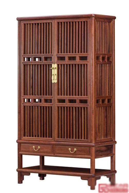 《透棂架格》同样选材红酸枝,整件家具全素身呈现,三面直棂条柜框的设计延续了明式家具的经典样式,简约且通透。