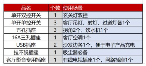 拿客厅和卧室来举例,客厅玄关要安装双控开关,电视机后要预留专用插座,沙发两边要预留USB插座,便于电子产品充电。卧室床头要安装双控开关,避免大冷天爬出被窝去关灯。