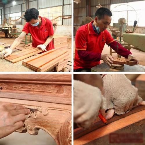 先进的烘干设备让木材含水率降到6%,突破南北方差异,实现家具不收缩、不爆裂;拥有十年经验的配料师傅依照家具设计图纸让木纹、色泽达到最合理的搭配;结合现代技术与传统工艺,榫卯构件精确度进一步保证家具的稳固;精湛的雕花工艺点缀家具器型,让产品锦上添花……
