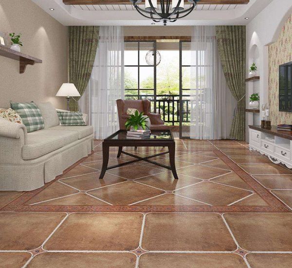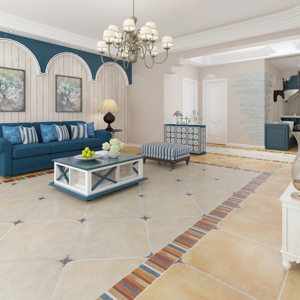 优质客厅地板砖设计,除了瓷砖本身以外,其辅料也是至关重要的,比如说拼花、波导线、踢角线等等,可以为客厅增添美感,让地面更富层次变化。