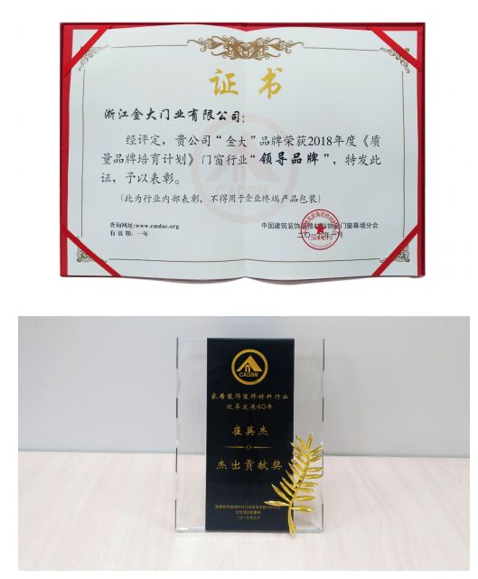 金大门业在防盗门行业精耕细作17年,奋力拼搏引领行业发展,所取得的成绩引行业瞩目,获得好评不断,曾在往年行业年会中荣获《门窗行业质量品牌培育计划》“入围企业”、“智能门行业十大品牌”等称号,总经理崔英杰曾获中国门窗行业“十大领军人物”、“十大风云人物”等荣誉。金大门业感谢行业协会对金大门业的充分肯定和认可,必将不忘初心,砥砺前行,顺应时代发展需求,在产品制造上生产更适合现代消费者需求的产品,在企业经营管理与创新发展中为行业做出表率,以匠心产品与金质服务不断为消费者提供更安全、更智能、更多元、更放心的消费体验,为千千万万家庭提供了居家安全保障。
