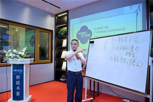 新欧木窗技术总工周先武在会上分享了《新欧木窗产品发展战略及市场分析》,他分析未来的行业趋势是重视品牌+产品来打造市场,其中高端门窗在家装市场拥有无限的发展前景和盈利空间。新欧铝包木门窗系统具有双重装饰效果,从室内看是温馨高雅的木窗,从室外看则是高贵豪华的铝合金窗。新欧铝包木门窗系统,所采用的五金传动部件均来自欧洲进口品牌,以奥地利MACO五金为主体,可做到框扇齐平;新欧的木材均选用名贵木材,特开创独木独板无指接工艺,使门框更具有高档木材纹理的自然奢华;新欧木材采用的表面处理材料是产自欧洲认证的门窗专用水性涂料,完全无污染,不含任何有害物质的环保产品;新欧木材的喷漆工艺采用两底两面的涂装工艺,水性涂料会在木材的表面形成一层封闭、牢固的保护膜,保护着木窗的木材不会受到外界的损伤。新欧一直以技术工艺研发为核心,在未来会把木材工艺提升到一个更高的水平,将采用无指接、独板装饰面,更好的提高生活美学装饰效果。