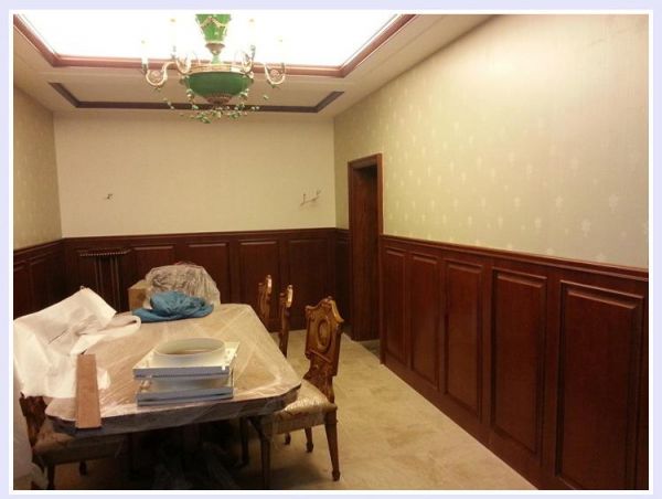 4、安装护墙板,首先按从左到右的方向将护墙板插入踢脚线内,最开始应从墙角开凹槽向墙角的位置。距护墙板上口1.5厘米的位置安装膨胀螺钉或者钢钉,要特别注意螺钉不能露在护墙板面外面。然后在腰线的凹槽处涂上专用胶,待几分钟后再插入凹凸面就可以了,在墙角处必须呈45度对角。