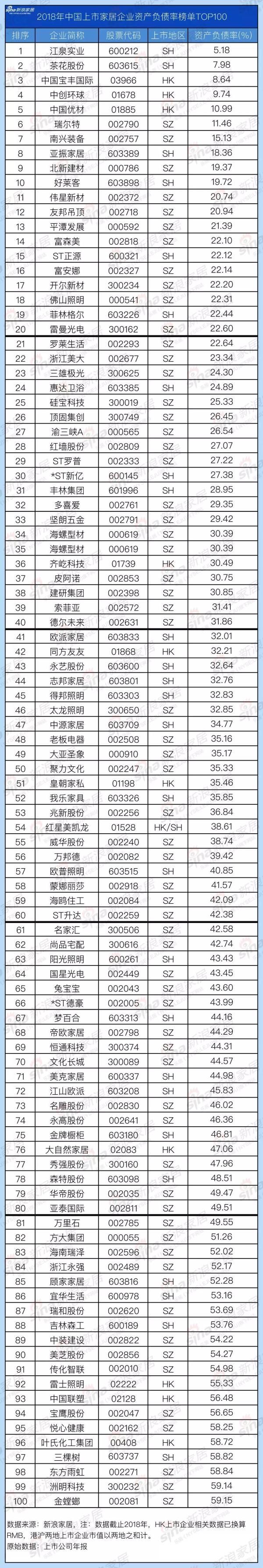 负债率较高有好处?2018年上市家居企业资产负债率榜单