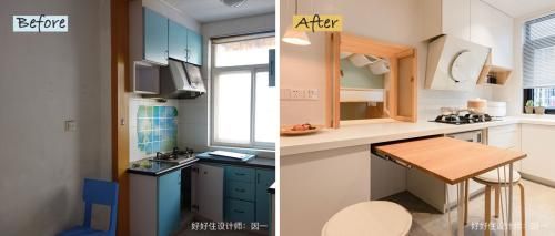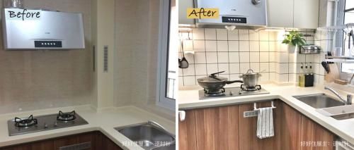随着城市新房越来越多出现的精装房,居住者的个性审美不易施展。住友逆时针为了增加精装房厨房的适用性和符合自己的审美喜好,在抽油烟机两侧增加吊柜,用防水防油的贴纸贴出小方砖效果,并增加暖光源的橱柜灯条,让千篇一律的精装房更像自己喜爱的居住样子。