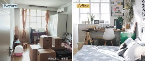 刚大学毕业的好好住用户钱东磊,用旧箱子+废弃抽屉做了床头柜,用植鞣革灯罩DIY台灯,用两只桌腿和老榆木门板拼了一个工作台,仅仅用4000元就改造了25平米的出租屋,房间里充满了朝气和阳光。