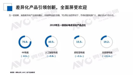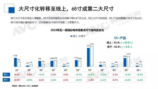 为什么说满足这几个元素的熊猫电视,是618彩电选购的首选呢?因为它们是真正符合目前彩电市场主流趋势的产品,从奥维云网公布的五一的市场销售占比情况来看,55英寸仍然是首选尺寸,无论线上线下占比都超过30%;分辨率方面,4K电视独占鳌头,占比达到76.8%;功能方面,人工智能越来越受到消费者喜爱,占比达到40.5%;外观方面,全面屏最受欢迎,占比达到19.2%,增长了15.4%。