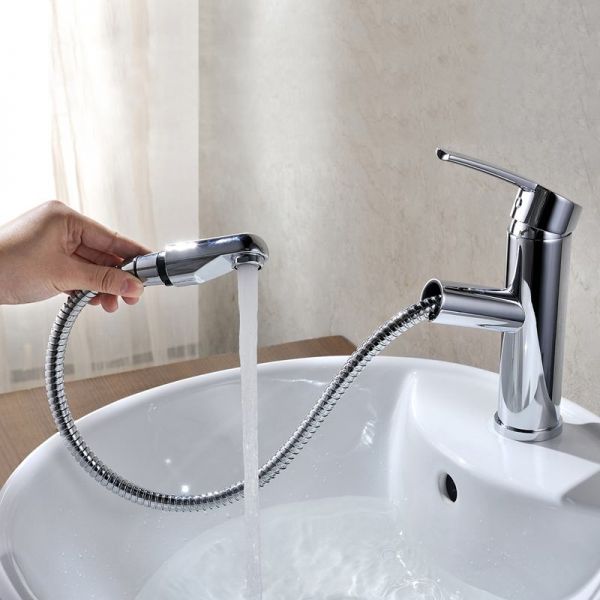 抽拉式水龙头非常人性化,可以拉出1.5米的不锈钢软管,旋转角度可达360度,不管炒菜加水、浇水,还是洗碗,都能真正做到想洗哪儿就洗哪,轻轻一按,就能灵活变化花洒水和龙头水。