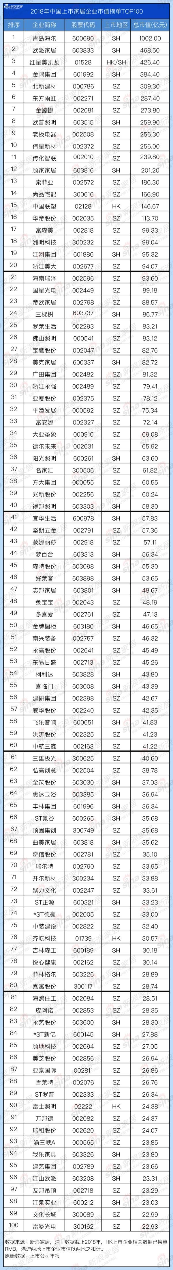 据新浪家居《2018年中国上市家居企业市值榜单TOP100》独家发布数据,2018年度,榜单100家上市家居企业总市值为9030.92亿元,较三季度增长26.70%(香港上市企业货币单位已折算为人民币,按1港元=0.8739人民币计)。青岛海尔、欧派家居、红星美凯龙、金隅集团、北新建材位列市值前五名。