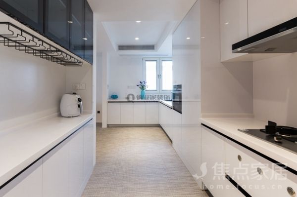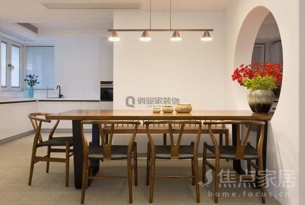 2、餐厨装修: 由于该房的使用情况特别,选择开放式厨房设计不仅符合业主需求,也能提高空间舒适度。同时餐厅隔断的“月洞墙”设计也是深化现代禅意装修的点睛之笔。