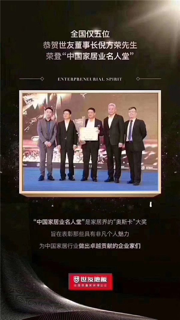 2019年五月,世友董事长倪方荣先生荣登“中国家居业名人堂”,这个全国仅五位的荣誉号称家居业的“奥斯卡”大奖,旨在表彰那些具有非凡个人魅力、为中国家居行业做出卓越贡献的企业家们。在企业发展期便具有长远战略眼光与民族技术创新精神的倪方荣,当之无愧受此荣誉。