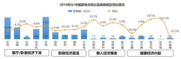 2019年Q1中国家电市场分品类规模及同比情况分析: