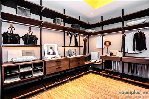 第一步迈入raumplus德禄展台,首先映入眼帘的UNO开放式衣帽间,黑色雾面质感金属立杆搭配深矩阵松层板组成的框架结构开放式衣帽间,色调沉稳,造型简洁,宛如高级成衣店一般的高端开放式收纳体验,外套、衬衣、围巾、配饰等各类物品一目了然、信手捏来,精彩的一天生活便从衣帽间开始了!