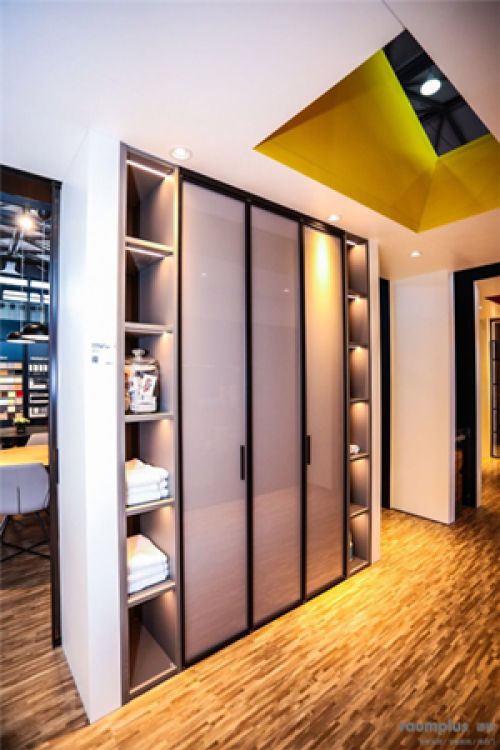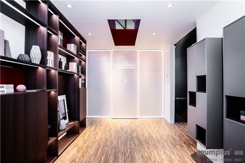 穿过走廊,设计款灯光移门展现着闪变的光华,营造出家居环境的绚丽风采。作为家居设计不可分割的一部分,raumplus德禄将灯光巧妙地运用于衣柜滑门上,让衣柜不只是作为一款家具产品来展现,更是烘托优雅、摩登、静美氛围的场景之一。而这款产品更曾荣获2016年家居风尚奖、2017年德国设计奖、2017标志性设计奖等多项殊荣。