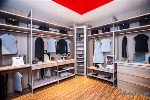 Cornice衣帽间又是一款获奖作品,这款曾获得被誉为产品设计界奥斯卡奖的德国IF以及全球最具影响力的工业设计大奖红点奖的产品,创新地运用超强韧性的铝合金侧框,无螺丝地连接层板,最宽可达2米,呈现出悬浮般摩登未来感。结合具有自主研发专利的旋转镜柜,令使用者在亦动亦静间享受着raumplus德禄追求极致的工艺灵动。