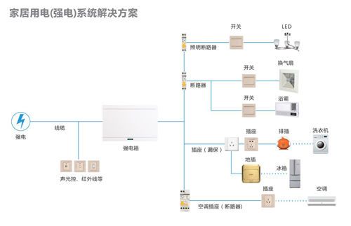 家居电气的强电一般泛指220V电路,主要是为终端用电设备(如灯、电热水器、冰箱)提供能源,以及在电能的输送、分配、通断过程中提供安全保护,如低压终端配电产品(配电箱、空气开关/断路器等)、开关、插座。