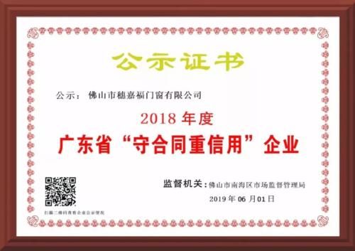 商道酬诚、喜讯传来!佛山市穗嘉福门窗(穗福门窗)连续两年获评“广东省守合同重信用企业”。