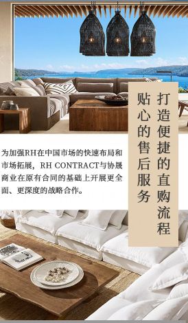为中国高端精英人士提供在中国境内的别墅、宅邸、精品公寓的配套服务,让中国客户有渠道享受美式最新最潮最具代表性的RH产品。直送到家,安装到位。