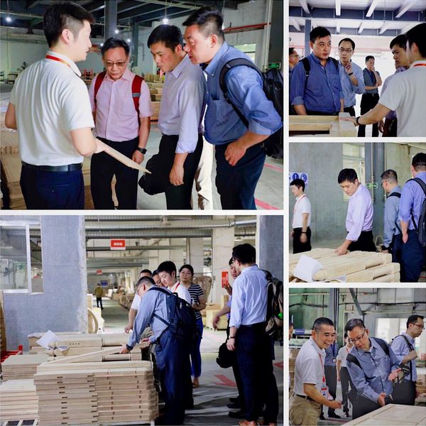 随后,刘主任一行在集团领导陪同下参观企业车间和展厅。在七彩人生生产中心吴文喜经理引领下,先后对企业的备料车间、抽盒线、实验室、木工车间、水性漆涂装线等进行了参观。