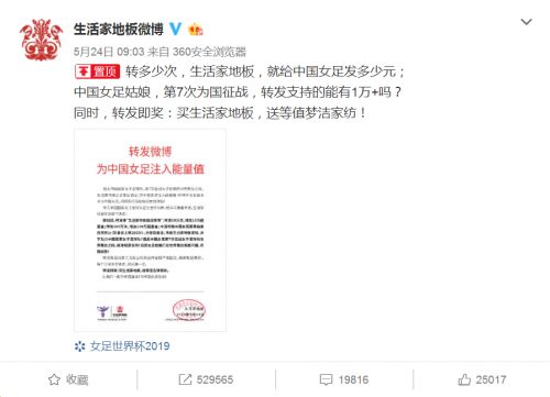转发多少次,生活家地板就给中国女足发多少元。每转1次,发1元;转发100万次,发100万元;转发200万次,发200万元……截止发稿时,这则微博转发量超过529565次,并且还在随着赛事的开展持续发酵,可见网友们对中国女足的宠爱程度。是的,这群中国足球姑娘,值得我们去爱!