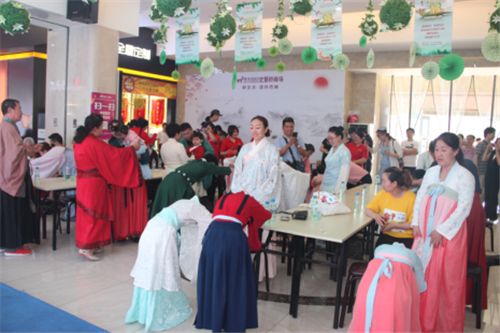 引人入胜的是6月9日下午2点半,正当促销进入焦灼状态时,大厅内上演的一场“端午汉服文化活动”。参与者有三口之家,有母女也有父子,有婆婆带着孙女,也有爷爷带着孙子。活动设置穿汉服学古礼、汉服走秀、猜字谜、盛唐夜唱、手工制作香囊等环节,参与者积极体验和互动,热闹而有序。