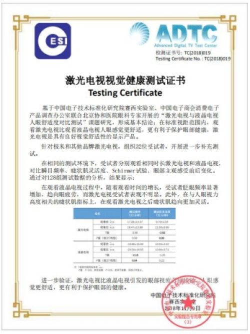 随着极米激光电视、智能投影等产品在市场上的快速普及,极米产品的护眼效果不但得到了大量消费者的认可,也得到了权威机构的研究验证。由中国电子技术标准化研究院赛西实验室、中国电子商会消费电子产品调查办公室,联合北京协和医院眼科专家开展的“激光电视与液晶电视人眼舒适度对比测试”课题研究中,明确表示在标准视距范围内,观看激光电视比观看液晶电视人眼感觉更舒适,更有利于保护眼部健康,激光电视是具有良好视觉舒适性的显示产品。而在此次课题研究中,极米激光电视皓·LUNE 4K也成为了首批获得《激光电视视觉健康测试证书》的产品。