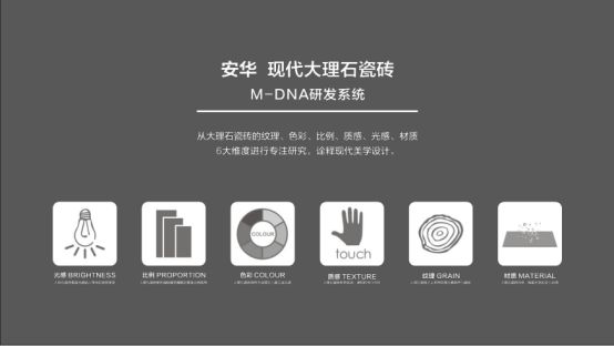 对于新生代消费者而言,追求设计感、有国际化审美、讲究生活品质感已然成为他们在大众眼中不可抹去的标签。他们喊着“颜值即正义”的口号,通过设计的手段将“家”变得更美,组成生活美学的一部分。面对消费者们的需求,安华瓷砖针对性的开发了M-DNA研发系统,从大理石的纹理、色彩、比例、质感、光感、材质6大维度进行专注研究现代大理石瓷砖,诠释现代美学设计。
